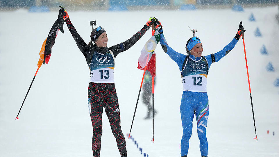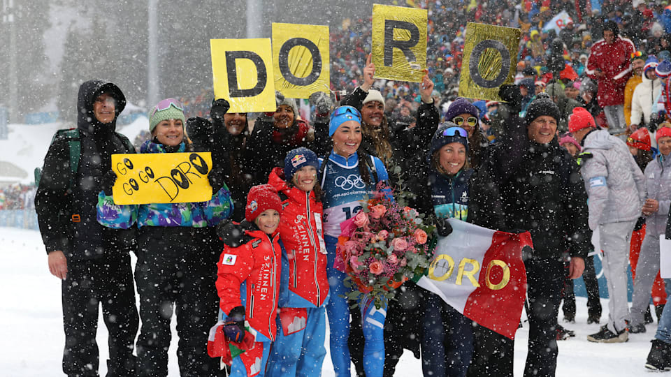 Franziska Preuss e Dorothea Wierer insieme al traguardo dopo la gara della mass start femminile di Milano Cortina 2026. Le due atlete, entrambe all'ultima gara della carriera, hanno deliziato il pubblico di Antholz-Anterselva con uno sprint davanti ai tifosi dopo il termine della competizione....Leggi di più La festa continua: la notte di Dorothea Wierer con la comunità di Antholz-Anterselva e non solo La festa non si è fermata alla Antholz-Anterselva Biathlon Arena. Dopo aver fatto interviste, foto e autografi tutto il pomeriggio sotto la neve, Dorothea Wierer ha continuato a festeggiare con i tifosi e le tifose del biathlon locali e non solo. Nell’area dedicata ai fan allestita appositamente per tutti i giorni di gara, si è continuato a celebrre la Campionessa per tutta la sera. Appassionati e appassionate di tutte le nazionalità hanno aspettato Wierer: emozionata e commossa nel vedere un video degli highlights della propria carriera sportiva da quando era bambina ai successi Olimpici, iridati e in Coppa del mondo, ha ringraziato i fan per il tanto supporto ricevuto negli anni. Il tutto mentre i tifosi intonavano cori al suon di Doro, Doro, Doro. Ma quali sono i ricordi più belli della carriera, secondo Dorothea Wierer? “Tantissimi, sono troppi anni che sono qua [dice ridendo]. Sicuramente la prima medaglia a Sochi 2014 è stata quella più inaspettata, dove poi appunto è cominciato tutto il mio percorso. Ho avuto la fortuna di festeggiare tantissimi successi. Non solo da sola, ma anche ai miei compagni e alla squadra. Sono troppi i giorni belli per essere elencati tutti”.