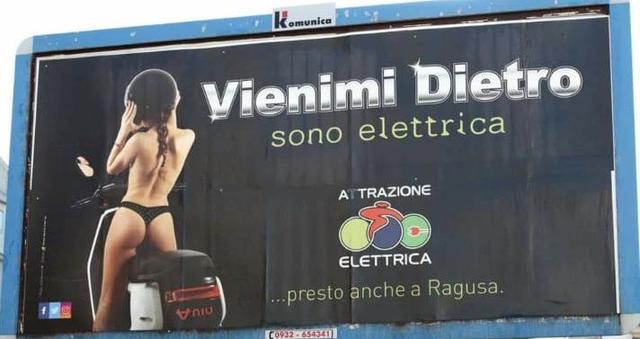 Un cartellone quasi pornografico a Ragusa ha scatenato l'indignazione sui social. Voleva sponsorizzare una moto elettrica con un'allusione sessuale. Lubrificanti, compro oro, persino le campagne di sensibilizzazione sull'alcol: sulla mercificazione del corpo delle donne non impariamo mai.Ci risiamo. L’ennesima donna nuda di fianco a un’allusione sessuale decisamente poco fraintendibile campeggia su un cartellone pubblicitario a Ragusa. Una ragazza di spalle a bordo di uno scooter intenta a mettersi un casco. Segni particolari: indossa soltanto un perizoma. Il claim della pubblicità: «Vienimi dietro. Sono elettrica».L’AMBIENTE VA RISPETTATO, LE DONNE NOSiamo nel 2020 e nella ridente cittadina siciliana qualcuno ha ancora il coraggio di sedersi in un ufficio e partorire una porcheria del genere, che incarna all’ennesima potenza la più becera mercificazione del corpo femminile per vendere un prodotto assieme a una volgare allusione sessuale. Nessuna informazione sul prodotto da sponsorizzare, solo lei con il suo invito quasi pornografico. Dell’azienda in questione sappiamo solo che la sua mobilità elettrica è sostenibile. Perché l’ambiente va rispettato, il genere femminile invece no, calpestiamolo pure. [ ..... continua qui sul sito ]
