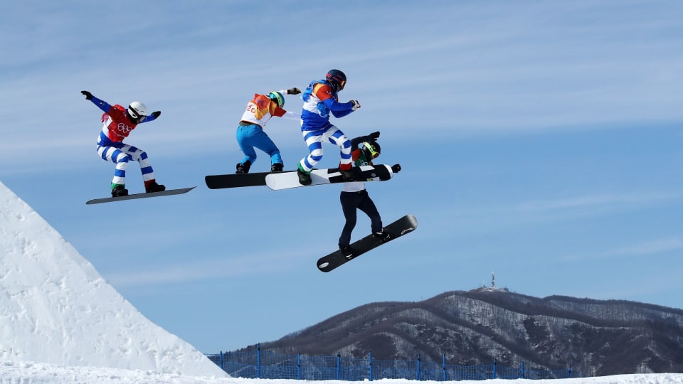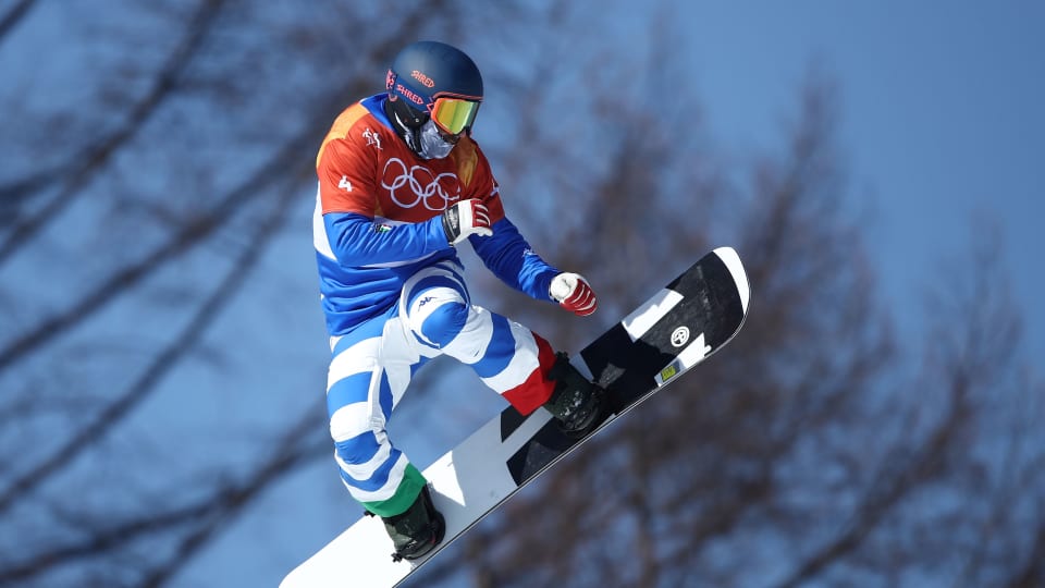 Emanuel Perathoner, in blu, si è classificato quindicesimo nello snowboard cross ai Giochi Olimpici di PyeongChang 2018.