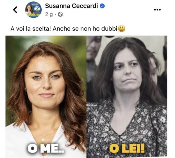 La sua collega Susanna Ceccardi è invece l’autrice del famigerato post su X durante la campagna elettorale per le Europee 2024, quando scrisse «O me o lei» contrapponendo la sua immagine proprio a quella di Ilaria Salis, candidata con Avs; Ceccardi tra l’altro arrivò seconda dietro a Roberto Vannacci, e con oltre 33 mila preferenze fu la prima dei non eletti nell’Italia centrale: riuscì a ottenere il seggio solo perché l’ex “generalissimo” scelse un’altra circoscrizione, quella nord-occidentale, e quindi fu ripescata